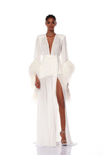 Drape yourself in opulence with our Geisha Blanc Maxi Dress, adorned with luxurious ostrich feather.