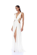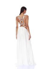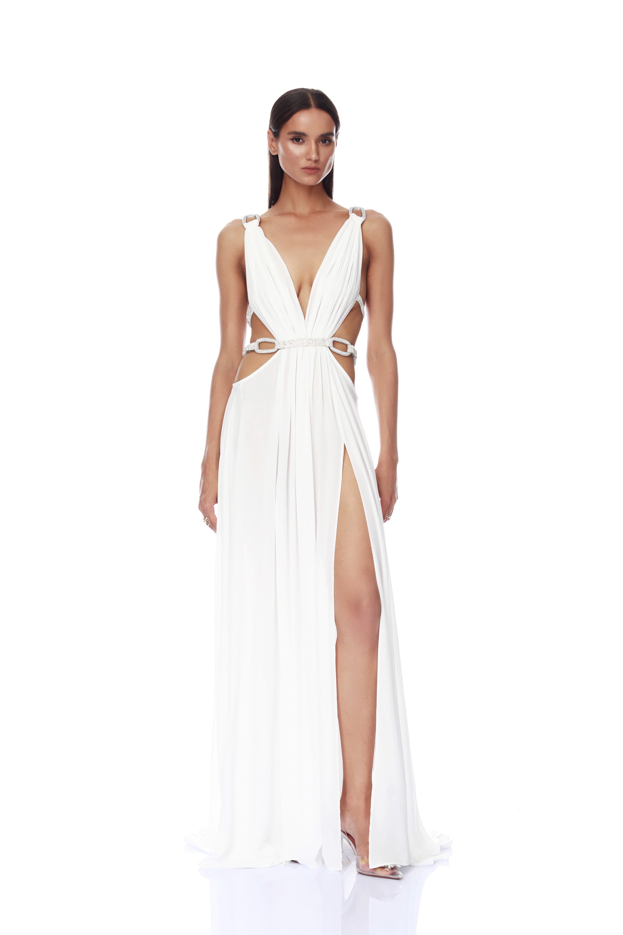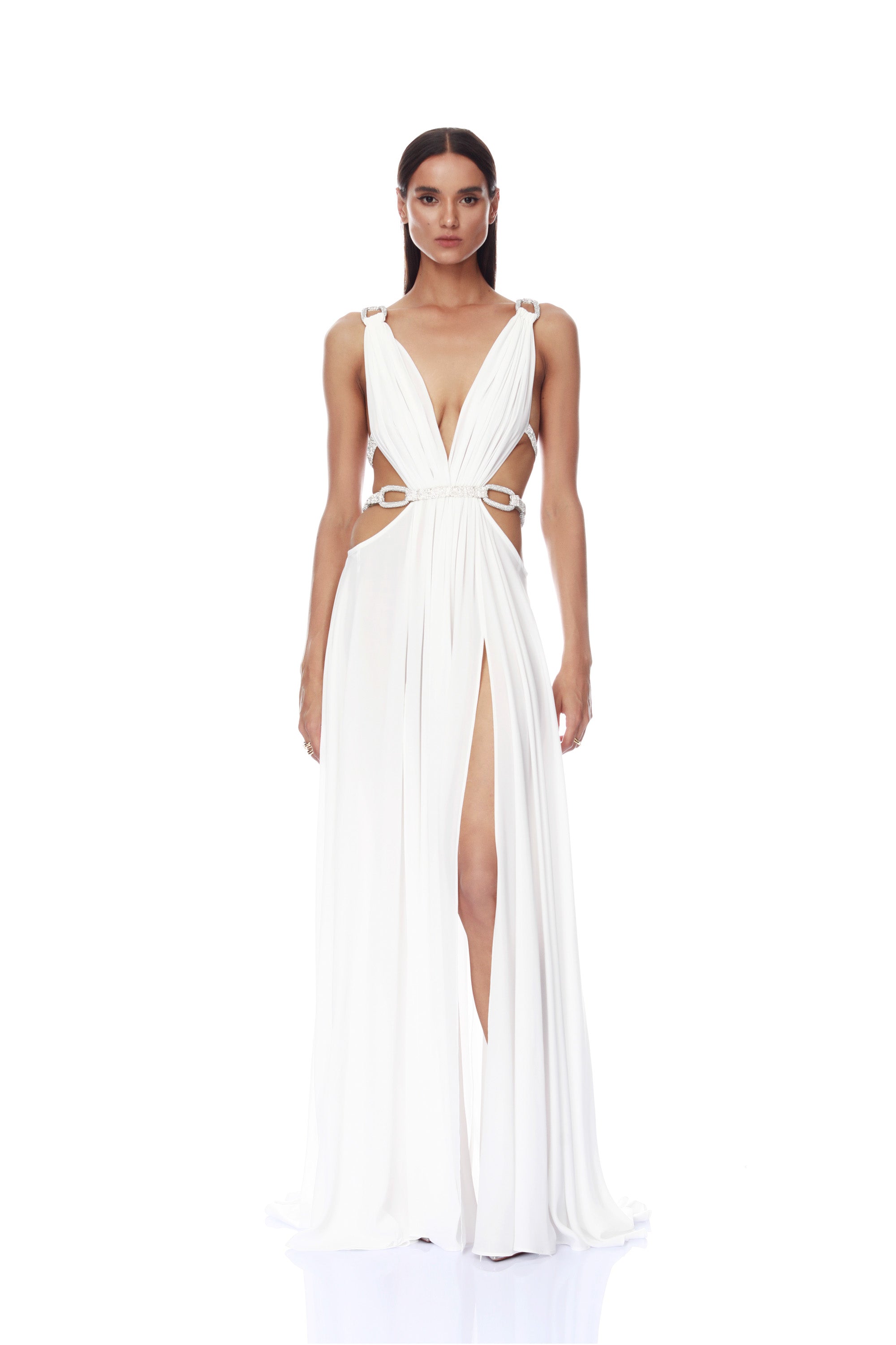 Stun in the Brielle Diamond Gown, with an chain-link open back and gathered skirt.