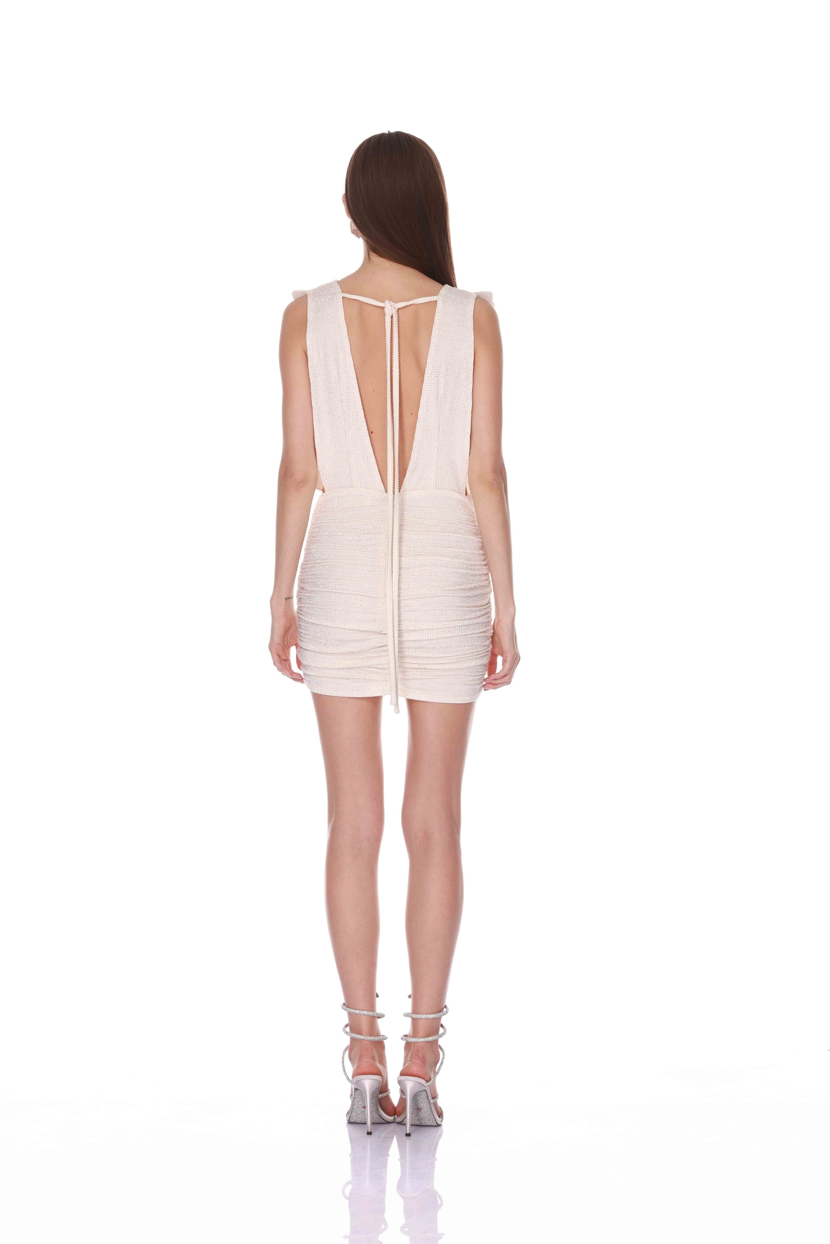 Plunging, draped mini dress in a rhinestone embellished fabric and bow details on the shoulders.