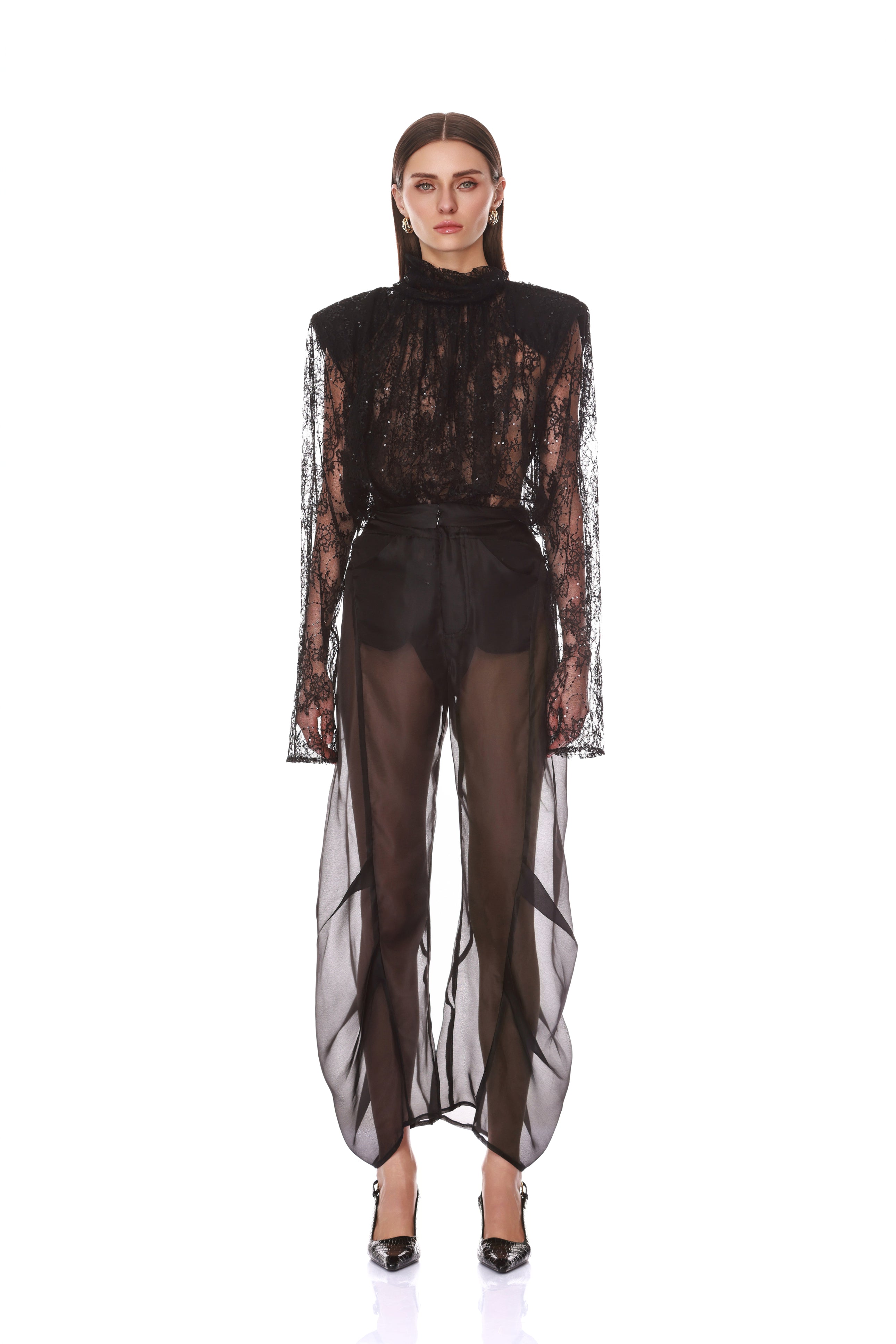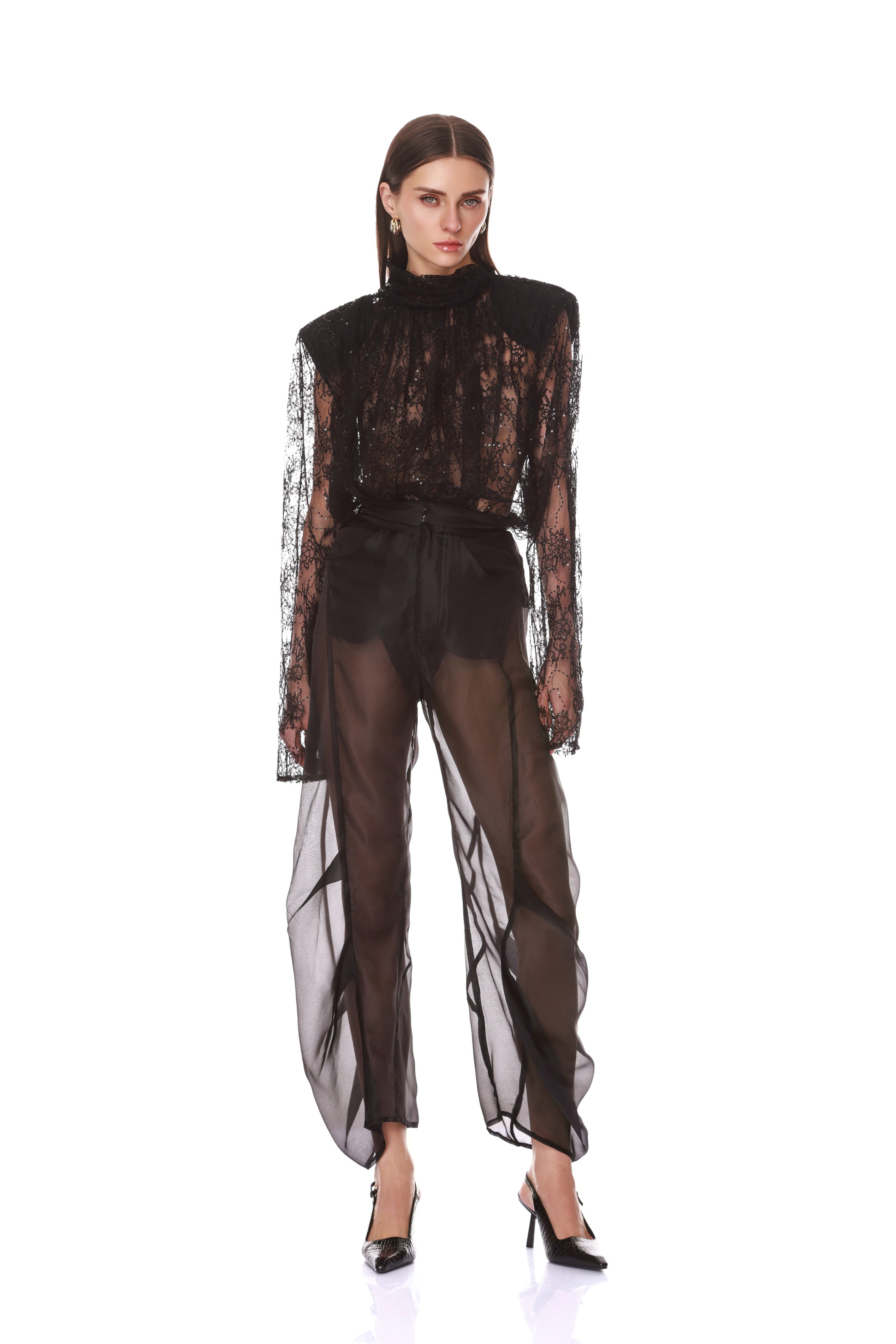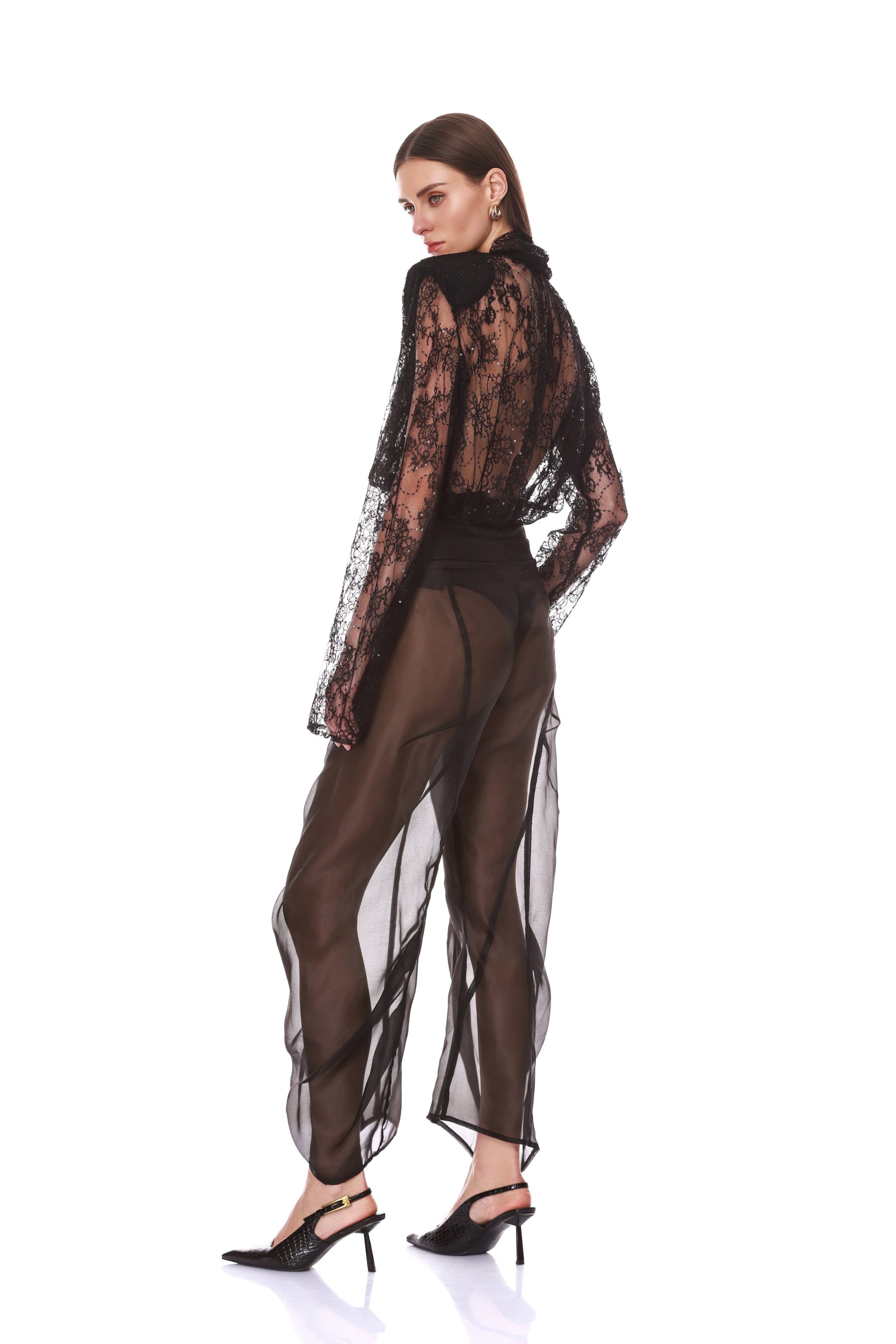 Look 5: Long Sleeve Sheer Blouse with Tie + Organza Pant