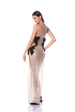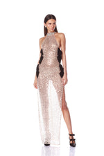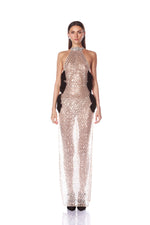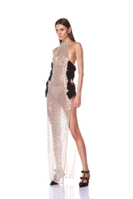Turn heads in the Maeve Halterneck Maxi, an elegant silver embellished dress with cutout details.
