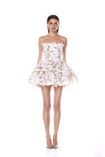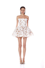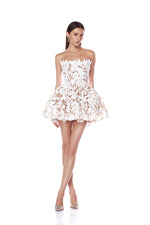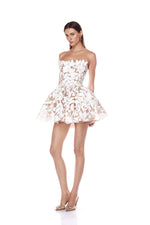 Strapless, corseted mini dress with structured peplum skirt and floral appliqué.