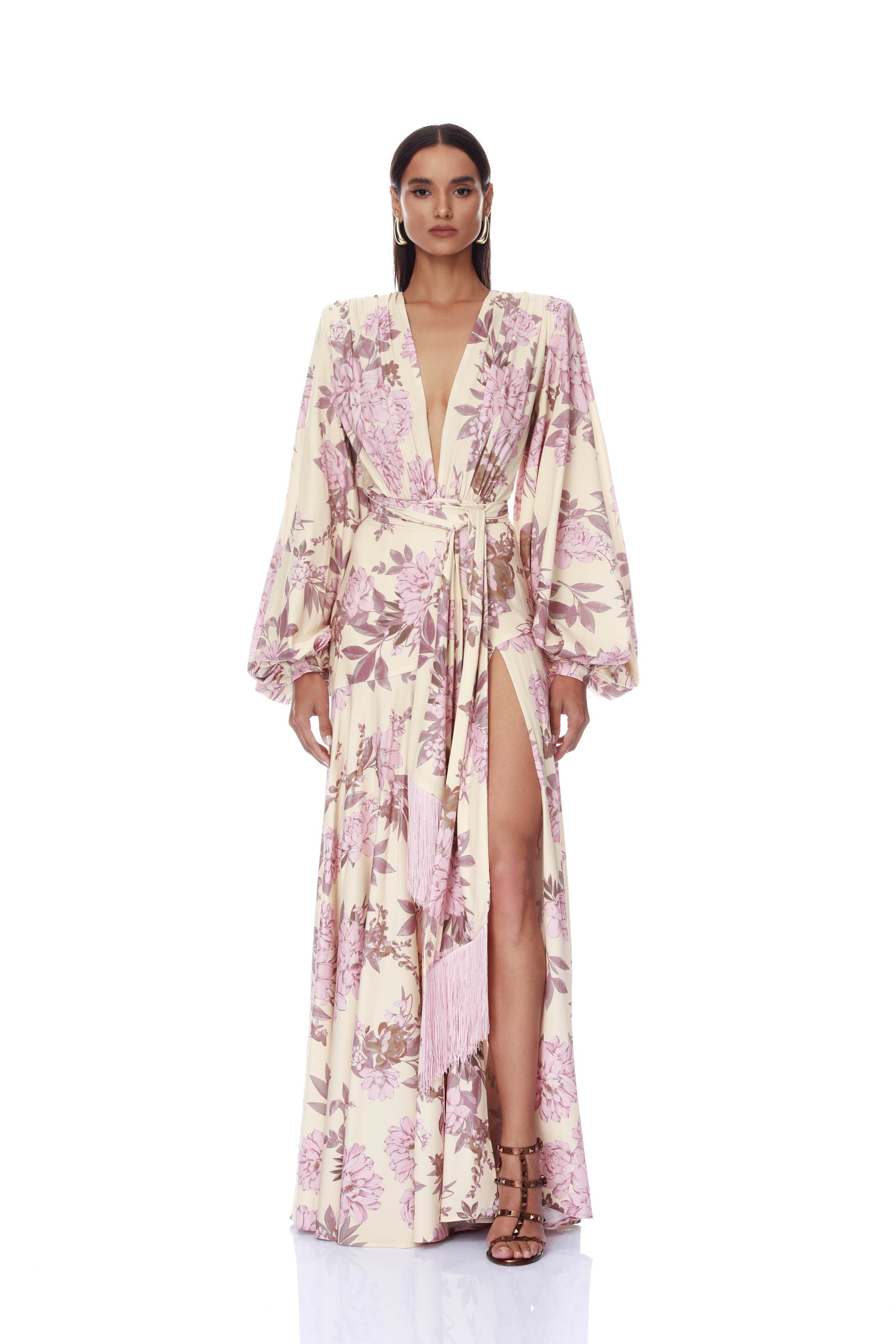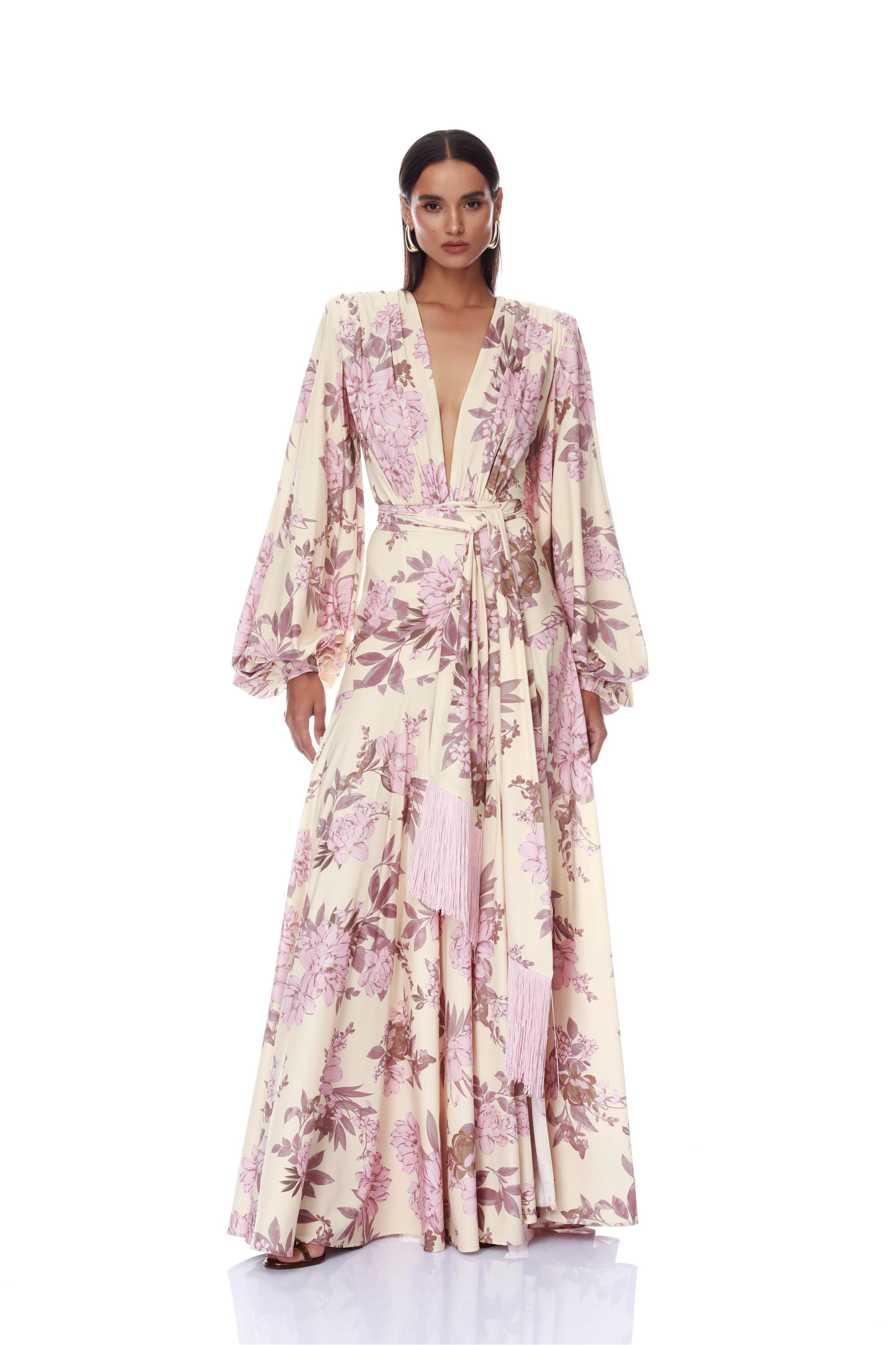 Experience the allure of the Magnolia Carmen Blush Gown, featuring gracefully long sleeves, and a removable belt for versatile styling this dress is designed to command attention.
