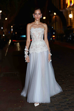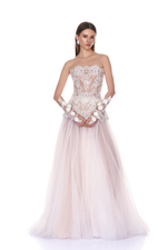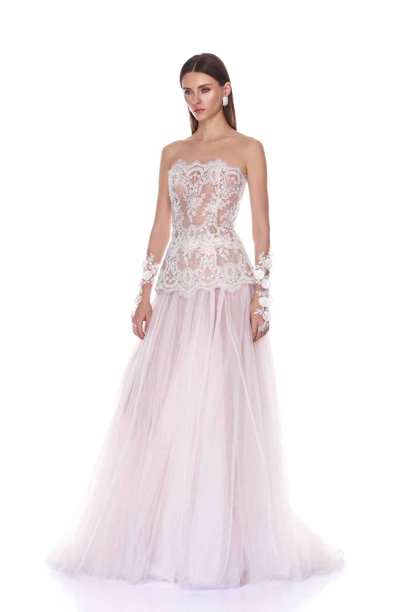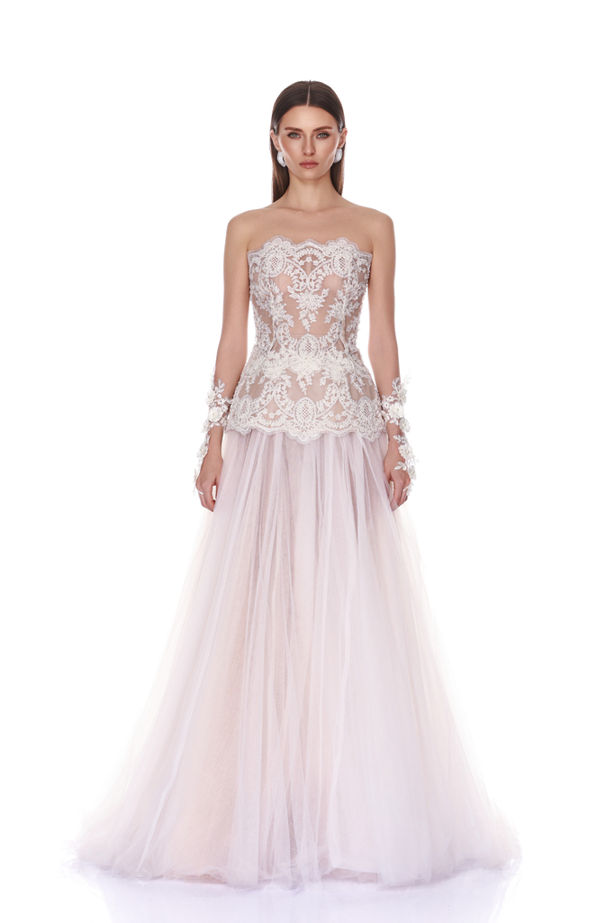 Strapless corseted tulle gown with embroidered lace bodice and floor-length skirt.